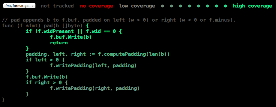 Let’s try counting statement execution for a standard package, the fmt formatting package. We run the test and write out a coverage profile so we can present the information nicely afterwards.