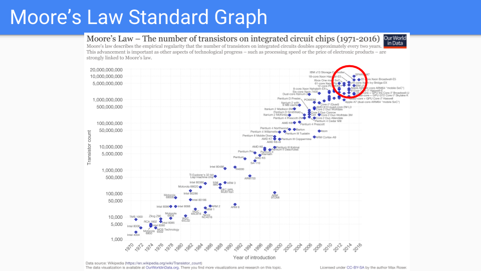 Let’s take a look at this graph. This is your classic Moore’s law graph. You have a log scale on the Y axis showing the number of transistors in a single chip. The X-axis is the years between 1971 and 2016. I will note that these are the years when someone somewhere predicted that Moore’s law was dead.