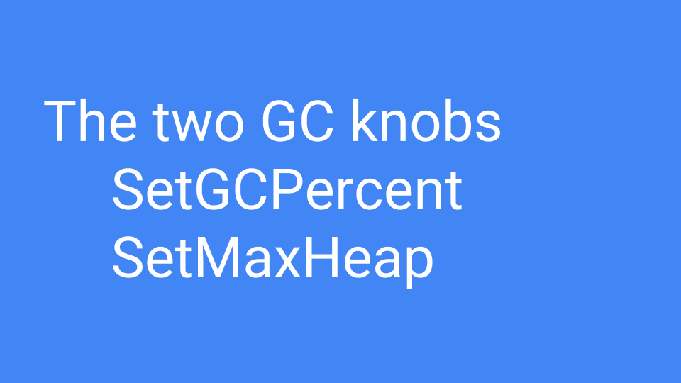 Go comes with two knobs to control the GC. The first one is GCPercent. Basically this is a knob that adjusts how much CPU you want to use and how much memory you want to use. The default is 100 which means that half the heap is dedicated to live memory and half the heap is dedicated to allocation. You can modify this in either direction.