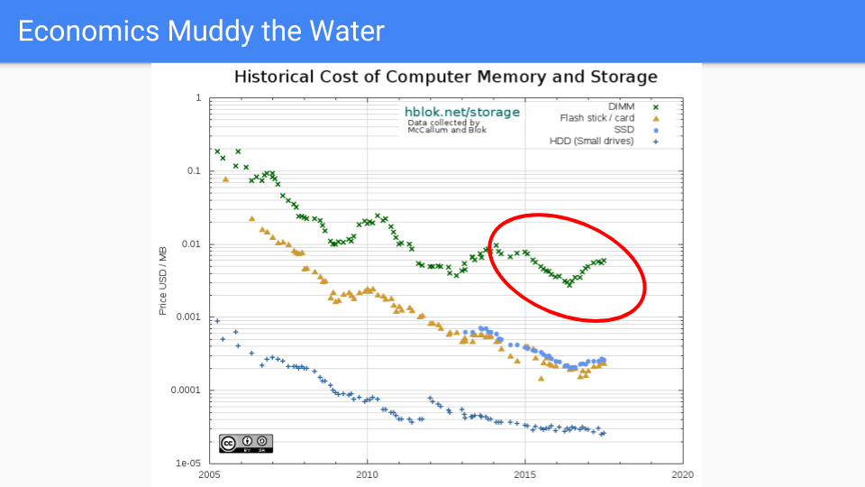 Let’s look at another graph focused on DRAM. These are numbers from a recent PhD thesis from CMU. If we look at this we see that Moore’s law is the blue line. The red line is capacity and it seems to be following Moore’s law. Oddly enough I saw a graph that goes all the way back to 1939 when we were using drum memory and that capacity and Moore’s law were chugging along together so this graph has been going on for a long time, certainly longer than probably anybody in this room has been alive.
