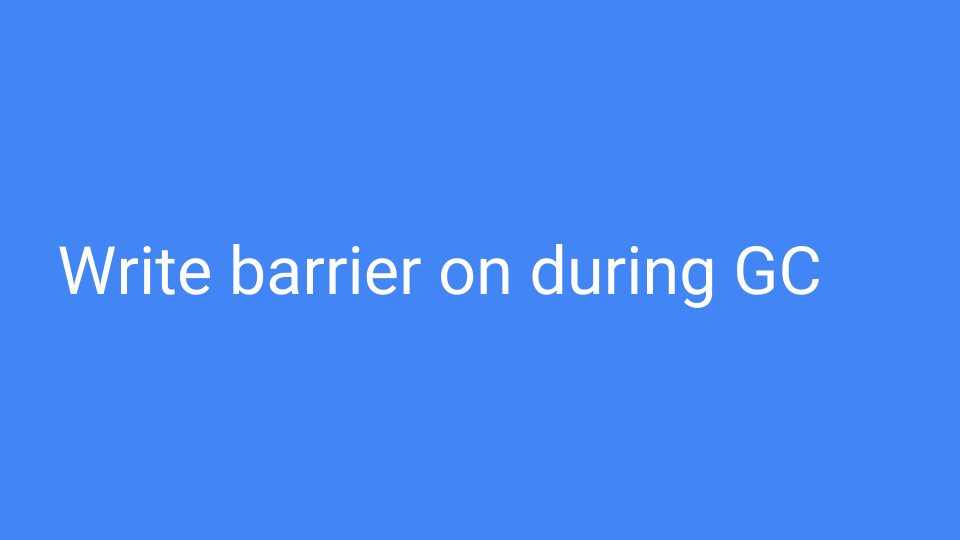 So what about write barriers? The write barrier is on only during the GC. At other times the compiled code loads a global variable and looks at it. Since the GC was typically off the hardware correctly speculates to branch around the write barrier. When we are inside the GC that variable is different, and the write barrier is responsible for ensuring that no reachable objects get lost during the tri-color operations.