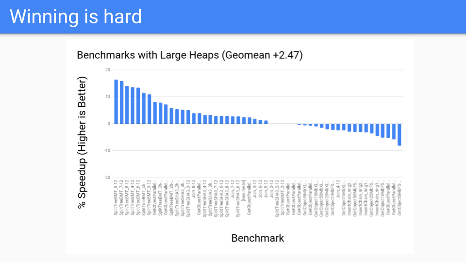 We took the measurement. This is pretty good. This is the benchmark suite for large heaps which should be good.