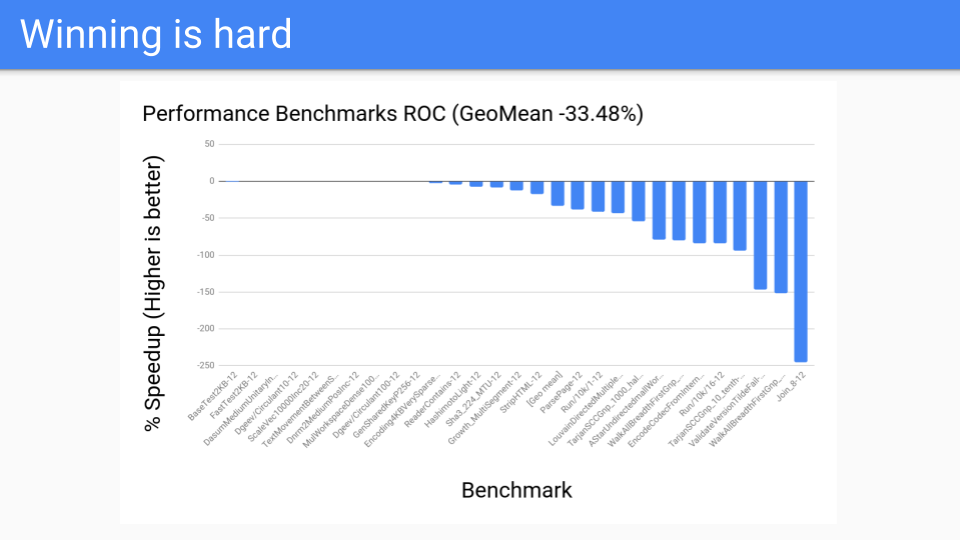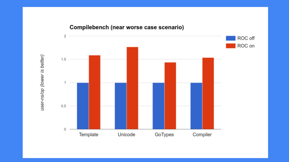 But that wasn’t good enough, we also had to make sure that ROC didn’t slow down other pieces of the system. At that point there was a lot of concern about our compiler and we could not slow down our compilers. Unfortunately the compilers were exactly the programs that ROC did not do well at. We were seeing 30, 40, 50% and more slowdowns and that was unacceptable. Go is proud of how fast its compiler is so we couldn’t slow the compiler down, certainly not this much.
