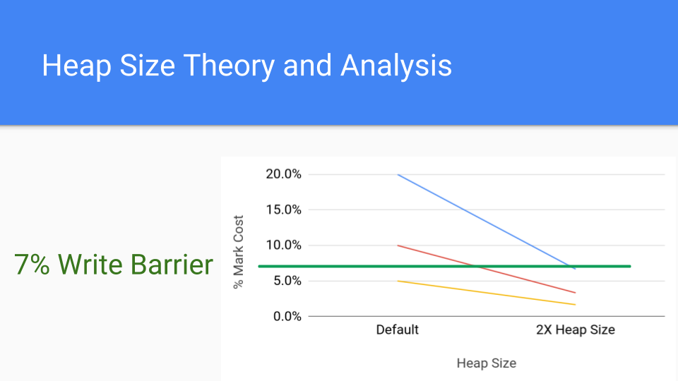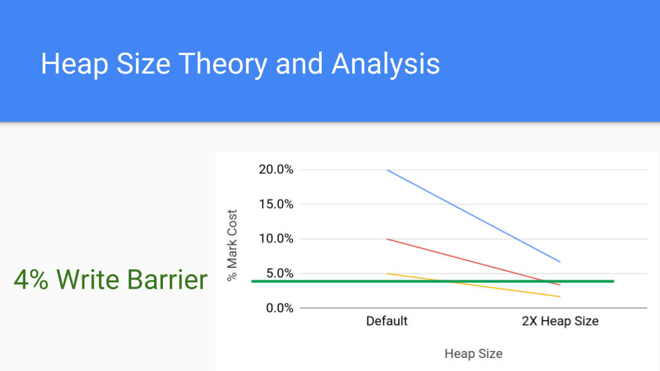 Let’s look at this graph. It’s just an analytical graph of mark costs. Each line represents a different application that might have a mark cost. Say your mark cost is 20%, which is pretty high but it’s possible. The red line is 10%, which is still high. The lower line is 5% which is about what a write barrier costs these days. So what happens if you double the heap size? That’s the point on the right. The cumulative cost of the mark phase drops considerably since GC cycles are less frequent. The write barrier costs are constant so the cost of increasing the heap size will drive that marking cost underneath the cost of the write barrier.