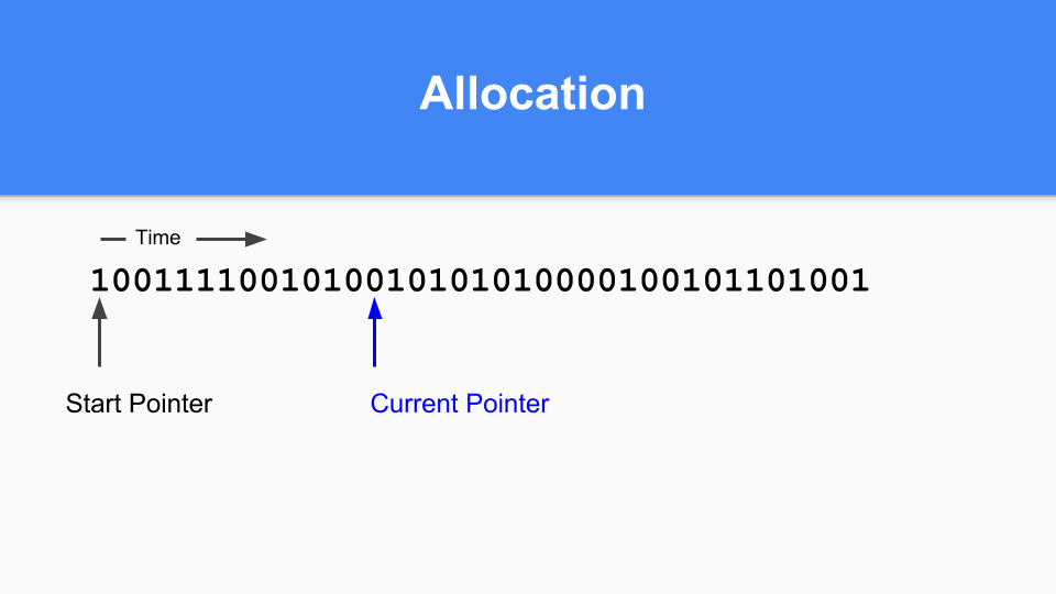 So how is this going to work in a non-moving situation? Here is the mark / allocation map. Basically you maintain a current pointer. When you are allocating you look for the next zero and when you find that zero you allocate an object in that space.