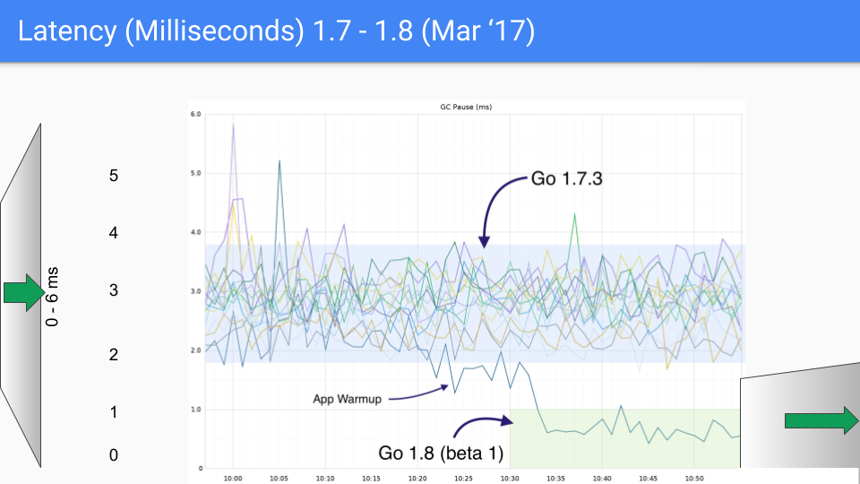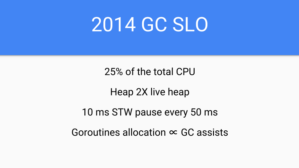 But short term 2014 we had to get our act together. We had to convert all of the runtime and compiler to Go. They were written in C at the time. No more C, no long tail of bugs due to C coders not understanding GC but having a cool idea about how to copy strings. We also needed something quickly and focused on latency but the performance hit had to be less than the speedups provided by the compiler. So we were limited. We had basically a year of compiler performance improvements that we could eat up by making the GC concurrent. But that was it. We couldn’t slow down Go programs. That would have been untenable in 2014.