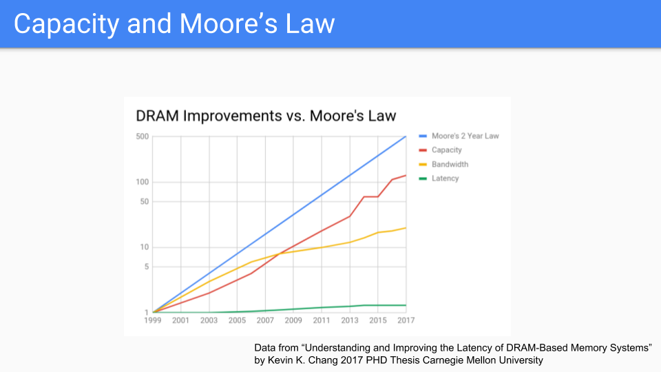 (Data from “Understanding and Improving the Latency of DRAM-Based Memory Systems Submitted in partial fulfillment of the requirements for the degree of Doctor of Philosophy in Electrical and Computer Engineering Kevin K. Chang M.S., Electrical & Computer Engineering, Carnegie Mellon University B.S., Electrical & Computer Engineering, Carnegie Mellon University Carnegie Mellon University Pittsburgh, PA May, 2017”. See Kevin K. Chang’s thesis. The original graph in the introduction was not in a form that I could draw a Moore’s law line on it easily so I changed the X-axis to be more uniform.)
