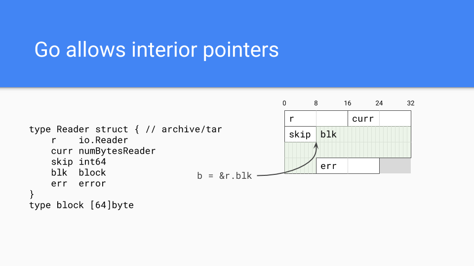 This one design decision has led to some of the more amazing things that have to go on with the runtime. It is probably the most important thing that differentiates Go from other GCed languages.