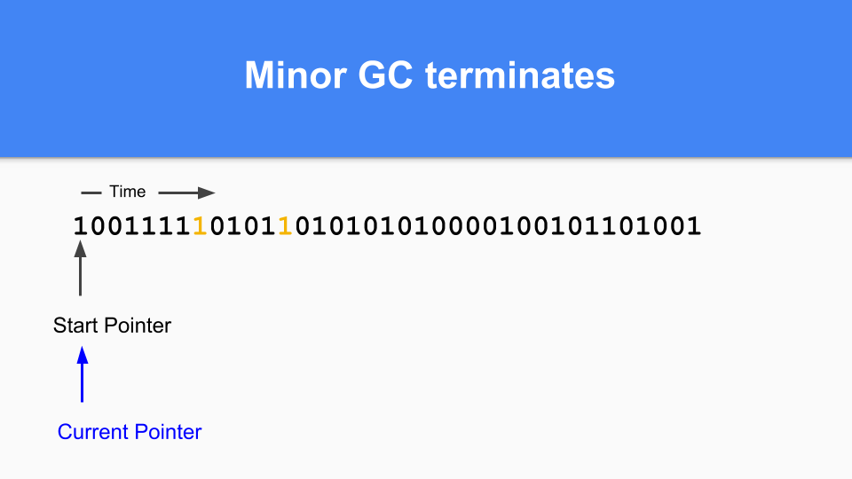 Finally, to finish your generational GC cycle you simply set the current pointer back to the start of the vector and you can continue. All the zeros weren’t reached during that GC cycle so are free and can be reused. As many of you know this is called ‘sticky bits’ and was invented by Hans Boehm and his colleagues.