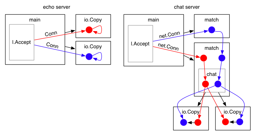 for { c, err := l.Accept() if err != nil { log.Fatal(err) } go io.Copy(c, c) }