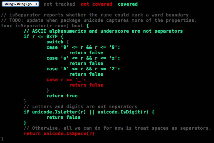 $ go test -coverprofile=cover.out $ go tool cover -func=cover.out strings/reader.go: Len 66.7% strings/strings.go: TrimSuffix 100.0% ... many lines omitted ... strings/strings.go: Replace 100.0% strings/strings.go: EqualFold 100.0% total: (statements) 96.4%